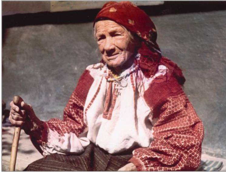 Жінка у сорочці з вишитими рукавами - "рукави червоні помальовані". с. Вербовець Косівського р-ну Івано-Франківської обл. З фондів Коломийського музею народного мистецтва Покуття та Гуцульщини. Фото І. Свйонтек. 1973 р. // Народна творчість та етнографія. — 2004. — № 3. — укр.